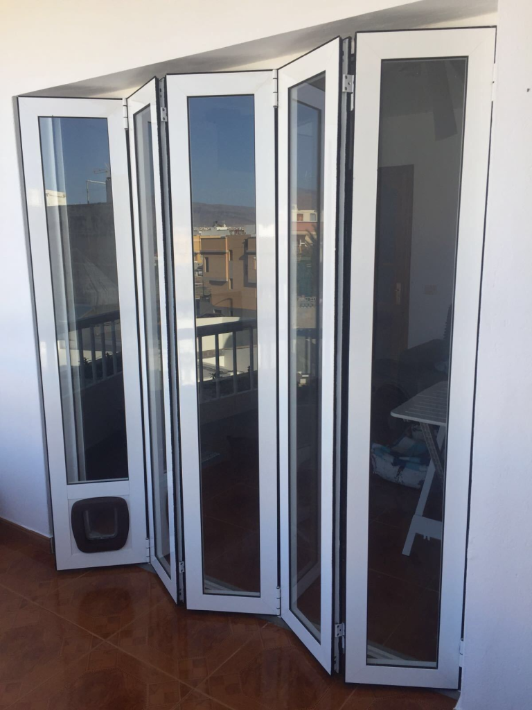Las puertas plegables son una opción versátil y funcional que permite abrir grandes espacios sin ocupar mucho sitio. Su sistema de apertura se basa en paneles que se pliegan sobre sí mismos, lo que facilita el máximo aprovechamiento del espacio disponible. Fabricadas en aluminio, estas puertas son resistentes, ligeras y de bajo mantenimiento, ideales tanto para interiores como exteriores, como patios o terrazas. Ofrecen un buen aislamiento térmico y acústico, y están disponibles en diferentes colores y acabados, permitiendo personalizar el diseño para adaptarse al estilo de tu hogar o negocio.